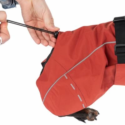 Az esőkabát vízlepergető, így optimális védelmet nyújt kutyájának a nedvesség ellen. Több ponton állítható, hogy tökéletesen illeszkedjen a kutya méretéhez. A rugalmas lábhurok gondoskodik arról, hogy a kabát még vad mozgás során se csúszkáljon el. Különösen jól mutat a nagyvonalúan vágott mellkasi hajtóka, amely védelmet nyújt a mellkasnak és a vállnak, mivel ezek a területek különösen érzékenyek.