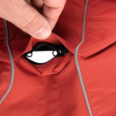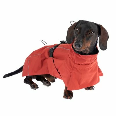 Elegáns esőkabát kis- és nagytestű kutyáknak. Kiváló minőségű kidolgozás, elegáns dizájn, vízlepergető anyagból. Több helyen állítható, sötétben fényvisszaverő, mosógépben mosható. Szín: rézpiros