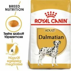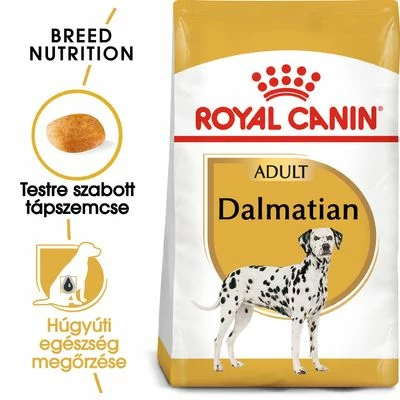 - Egészséges húgyutak: A Royal Canin Dalmatian Adult táp alacsony purin tartalmú, válogatott fehérjéket tartalmaz az egészséges húgyutak támogatása érdekében.
