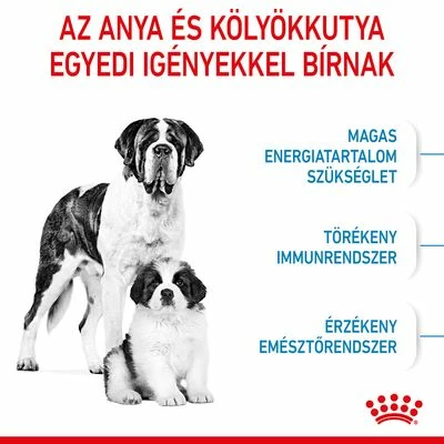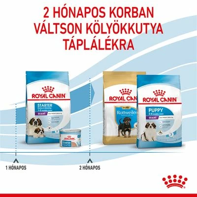 A Royal Canin GIant Starter Mother & Babydog tápot speicálisan óriás fajták, 45 kg feletti vemhes szukái és legfelejebb 2 hónapos kölykeik számára fejlesztették ki. A testre szabott táplálékot kifejezetten olyan nagy energiaszükségletű óriás testű ebeknek szánták, akik vemhességük végén járnak, és a szoptatási időszakra. Természetesen ideális a szopó kölyökkutyák megfelelő növekedésének támogatására is.