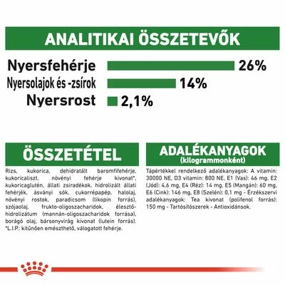 - A szőrzet állapota: olyan tápanyagokat tartalmaz, amelyek hozzájárulnak a bőr és a szőrzet egészségének megőrzéséhez.