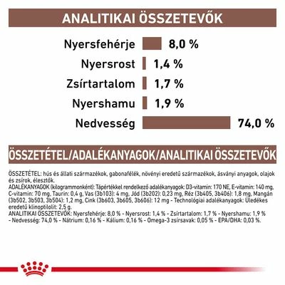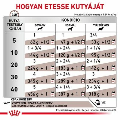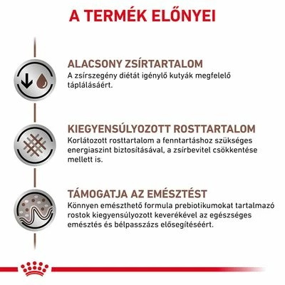 Ha kutyájának zsírcsökkentett étrendre van szüksége és ebből kifolyólag emésztési zavarokkal küzd, akkor nagyon fontos az olyan táplálék, melynek kifejlesztése során figyelembe vették ezeket a szempontokat. A Royal Canin Veterinary Canine Gastrointestinal Low Fat Mousse diétás, alacsony zsírtartalmú nedves kutyaeledel, melyet speciálisan az emésztés támogatására és a zsíranyagcsere szabályozására gyártottak hiperlipidémia esetére. Az ízletes receptúrával kombinált, könnyen emészthető összetevők gondoskodnak arról, hogy négylábúja az alacsony zsírtartalom ellenére is elengedő energiához jusson.